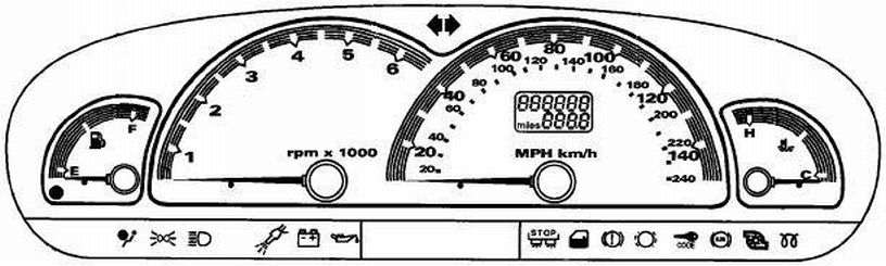 | sárga | EOBD figyelmeztető lámpa* | - amikor rendellenesség lép fel az üzemanyag-befecskendező vagy a gyújtási rendszerben, amely megnövekedett károsanyag kibocsátással, a motorteljesítmény visszaesésével, többletfogyasztással járhat. Ebben az esetben az út folytatható, de nem szabad terhelni a motort, mert az károsodhat! - amikor a gyújtáskulcsot MAR állásba fordítjuk, de néhány másodperc múlva ki kell aludnia. - a katalizátor lehetséges meghibásodásakor (villogó fény). Megjegyzés: EOBD-vel (European On-Board Diagnosis, Európai Fedélzeti Diagnosztikai Rendszer, vagy Motor Károsanyag Kibocsátás Ellenőrző Rendszer) csak az EURO III-as környezetvédelmi normát teljesítő benzinmotorok vannak felszerelve. Az EOBD figyelmeztető lámpa a fent tárgyalt "üzemzavar a befecskendező rendszerben" visszajelzőt váltotta ezeknél a motorváltozatoknál; működése, szerepe ahhoz hasonló. | |